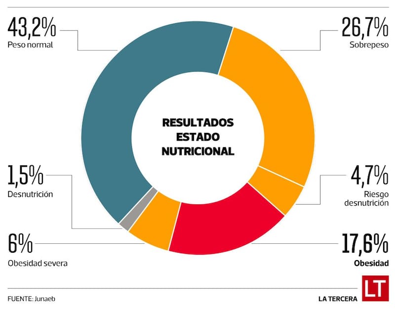 Con una participación de 5.659 establecimientos educacionales (76,9% a nivel nacional) y 524.274 mediciones válidas, los resultados de la encuesta, a los que tuvo acceso La Tercera, visibilizan mejores cifras, con un aumento de estudiantes con estado nutricional normal pasando del 41,4% al 43,2%. El resto de los datos indican que el 26,7% de los escolares tiene sobrepeso; un 4,7%, riesgo de desnutrición; un 17,6%, obesidad; un 6%, obesidad severa, y un 1,5%, desnutrición. En la sumatoria, la tasa de malnutrición por exceso es del 50% a nivel país, una cifra que se viene reiterando en las últimas mediciones.