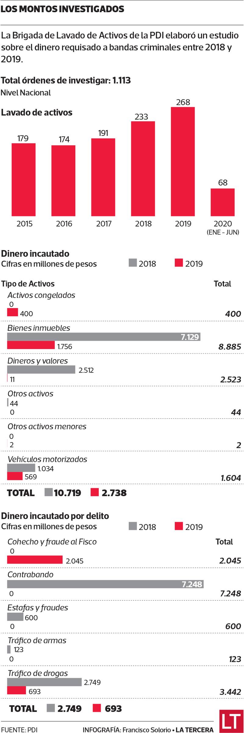 ¿Dónde se invierten mayoritariamente estos fondos? Según el análisis de la PDI, la mayor fuente desde la cual se pudo recuperar estos dineros “lavados” fueron las propiedades. Entre 2018 y 2019 se incautaron más de $ 8 mil millones en bienes inmuebles a nivel nacional.
