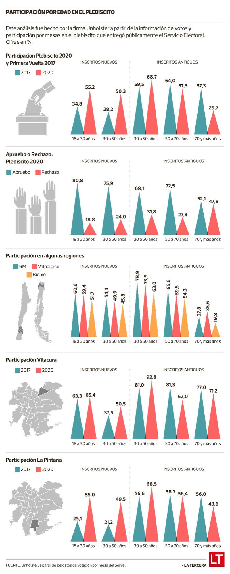 “Los grupos de inscritos antiguos mayores de 50 años vieron descender su participación, probablemente por miedo a contagiarse por Covid-19 o quizás porque el resultado del plebiscito era claro”, apunta el documento de Unholster, reflejando también que es posible que ese electorado pueda volver a participar en los comicios.