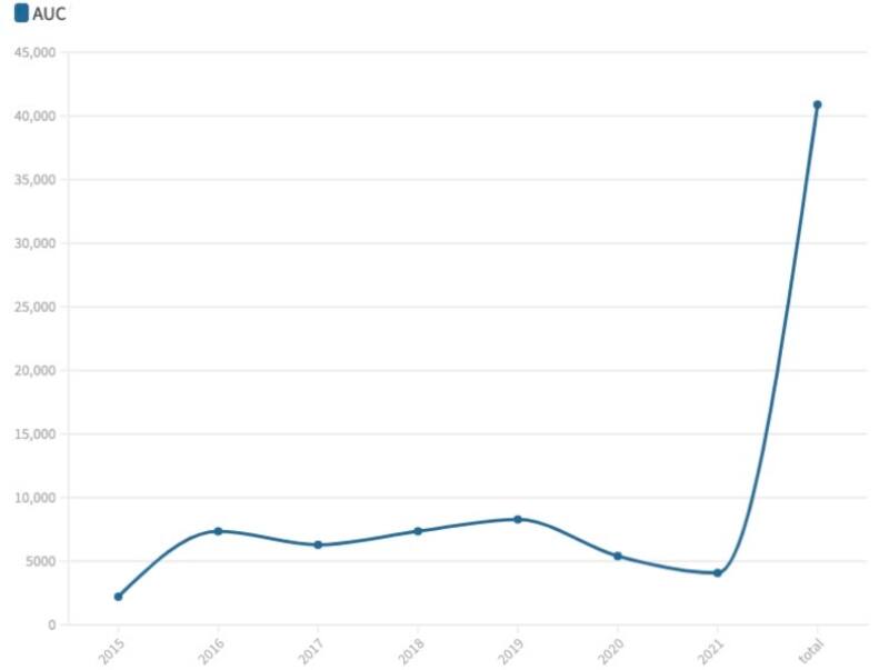 Estos representaron un 14% de los matrimonios realizados en el mismo periodo de tiempo (15.449). Una proporción entre AUC y matrimonios que en adelante se mantiene bajo un 16%, peak alcanzado en el primer semestre de 2021.
