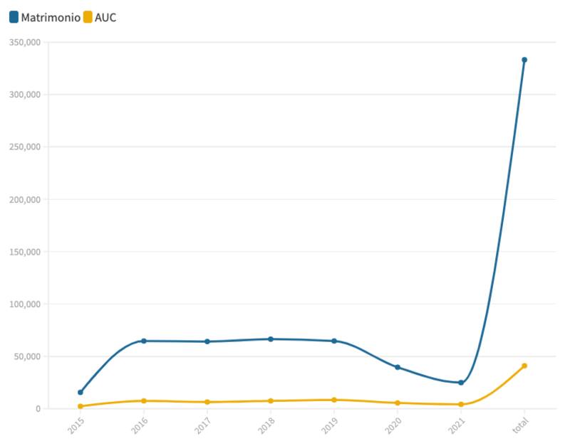 En suma, entre octubre de 2015 y julio de 2021, se registraron un total de 333.272 matrimonios y 40.894 AUC, los que -en el total global- representan un 12%.