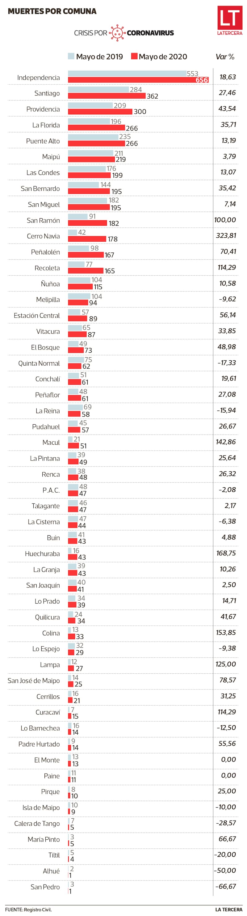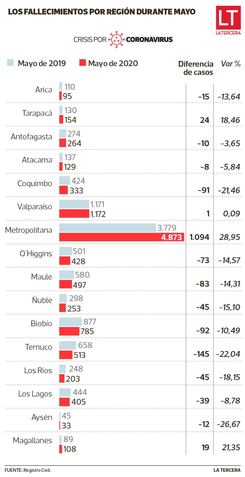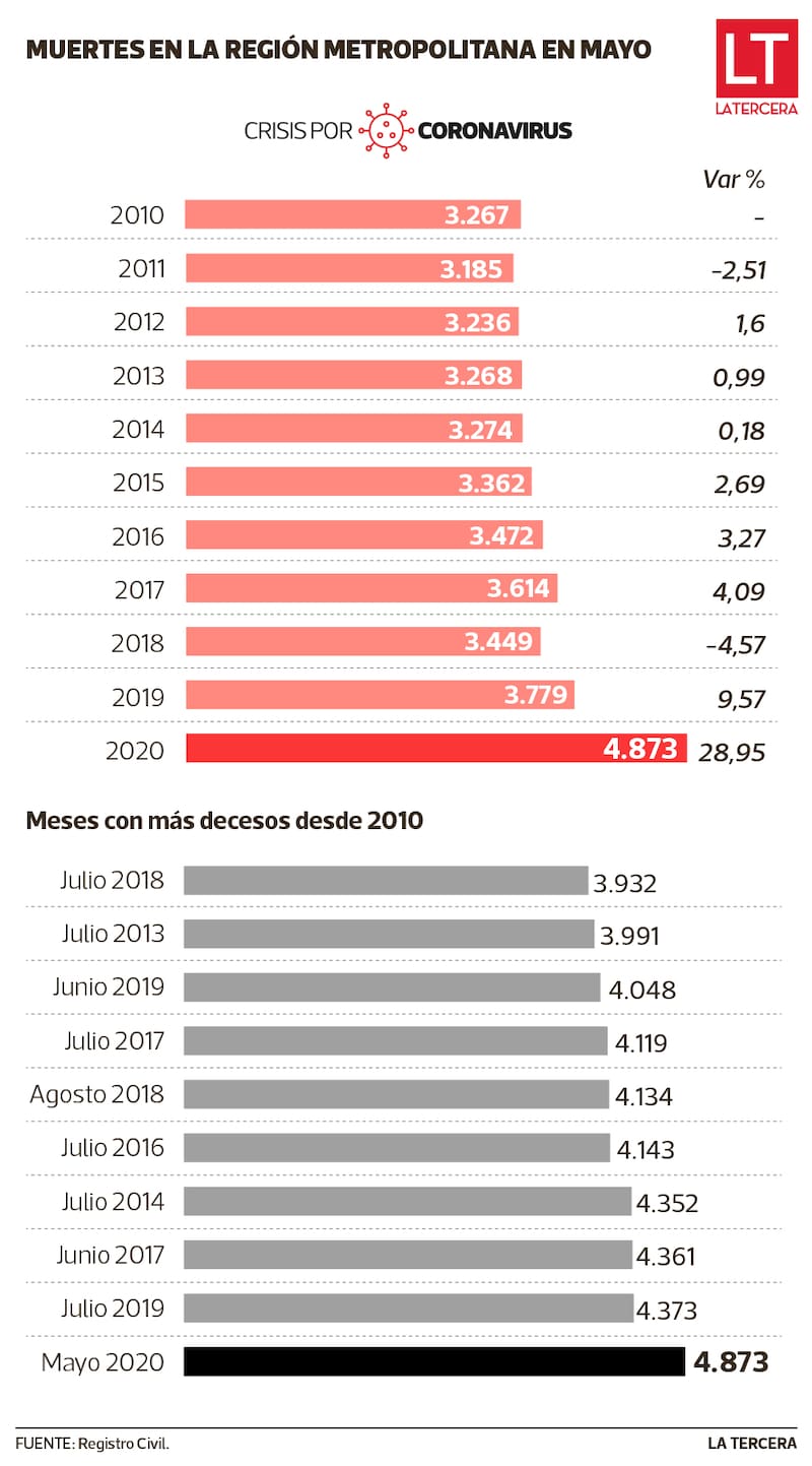 Lo que se entrega es la cantidad de muertes inscritas en el Registro Civil por cualquier causa: es decir, no es posible identificar con estos datos cuántos de los decesos están registrados como producto del coronavirus. Con todo, la información hasta el domingo del Ministerio de Salud señalaba que 665 personas murieron en la RM durante mayo con dicha enfermedad detectada.