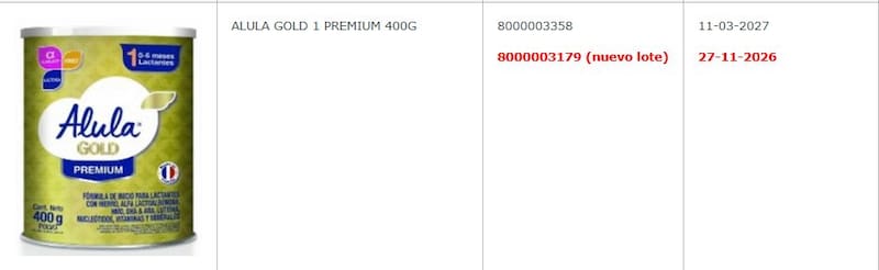 Esta jornada, el Ministerio de Salud (Minsal) informó que la empresa Sanulac Nutrición Chile reportó que, además de los productos afectados por la presencia de la toxina cereulida y que se encuentran retirando del mercado, también se incorpora a este listado de fórmulas infantiles afectados el producto Alula Gold 1 Premium en tarro de 400 g correspondiente al lote 8000003179 y con fecha de vencimiento 27-11-2026.