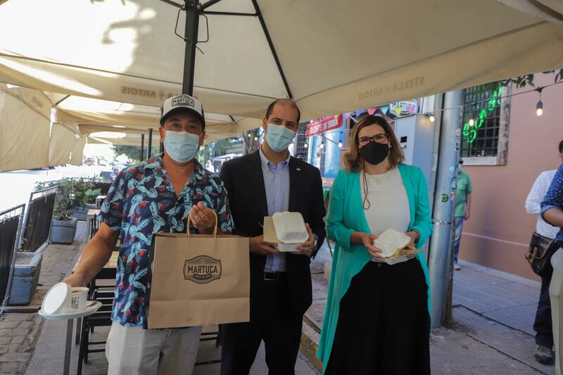 Junto a un equipo fiscalizador de la comuna, Naranjo y Vargas visitaron restaurantes del barrio Manuel Montt, constatando si se ha procedido a la eliminación de utensilios plásticos o el reemplazo por cubiertos reutilizables.