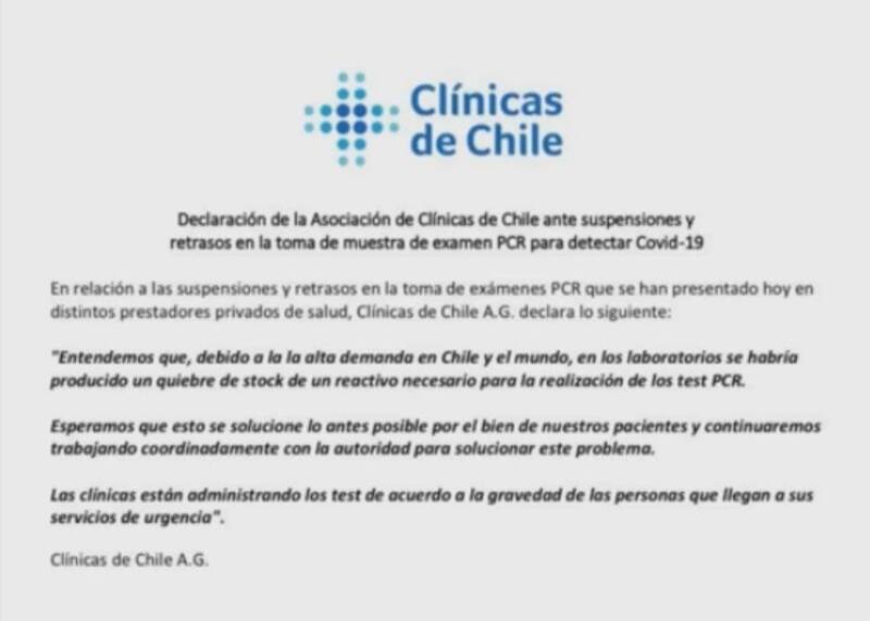 Por su parte Clínicas de Chile A. G., asociación gremial que reúne a los 38 principales prestadores de salud privados de Santiago y regiones, emitió una declaración sobre las suspensiones y retrasos en la toma de exámenes en su red de asociados planteando que “entendemos que debido a la alta demanda en Chile y el mundo, en los laboratorios se habría producido un quiebre de stock de un reactivo necesario para la realización de los test PCR”.