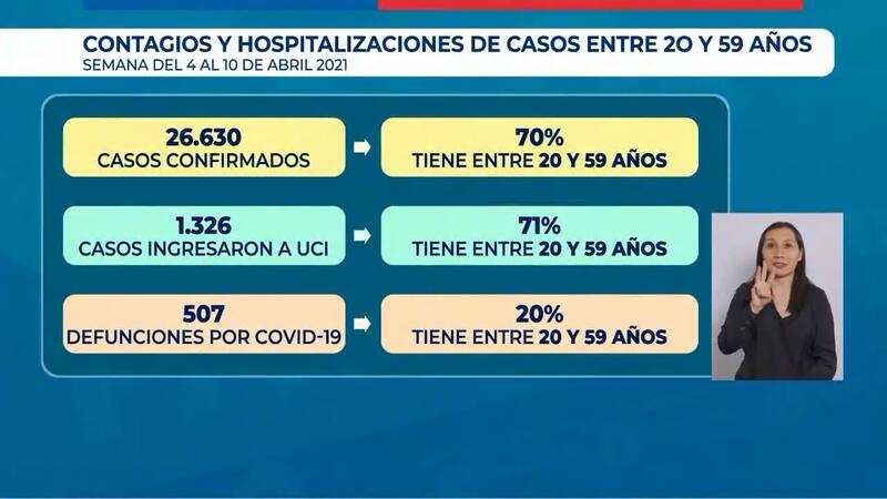 Según información dada a conocer por la subsecretaria, de los 26.630 casos confirmados durante la semana del 4 al 10 de abril, el 70% correspondió a personas entre 20 y 59 años.