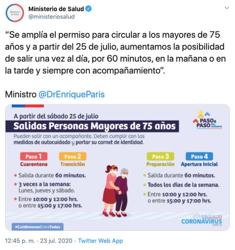 Por Claudia SotoMinsal modifica permiso para adultos mayores y amplia horarios para salir a la calle