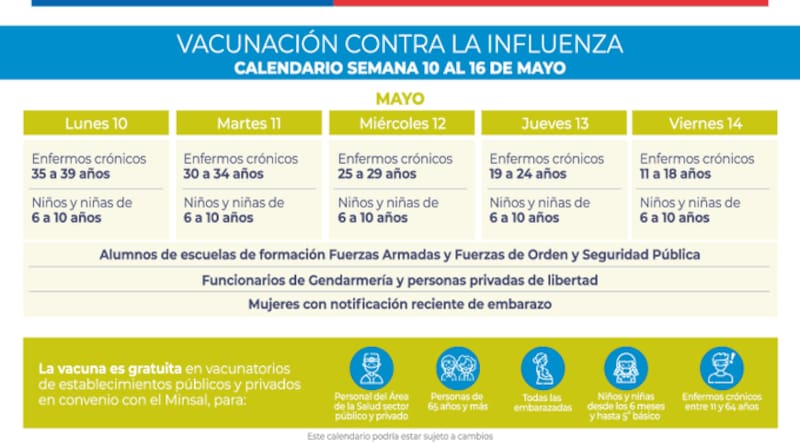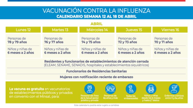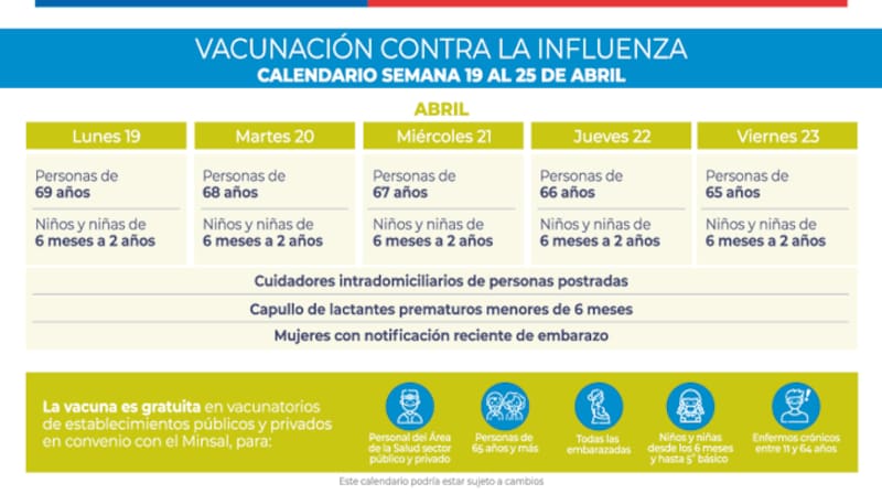 La dosis contra la Influenza es gratuita en los vacunatorios de establecimientos públicos y privados en convenio con el Minsal para el personal de salud, adultos mayores de 65 años, mujeres embarazadas, niños y niñas de 6 meses a 5to básico, y enfermos crónicos entre 11 y 65 años.