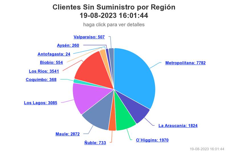 Según indica el sitio web de la Superintendencia de Electricidad y Combustibles, hasta las 16.01 horas, son 23.546 clientes no tienen suministro eléctrico en el país.