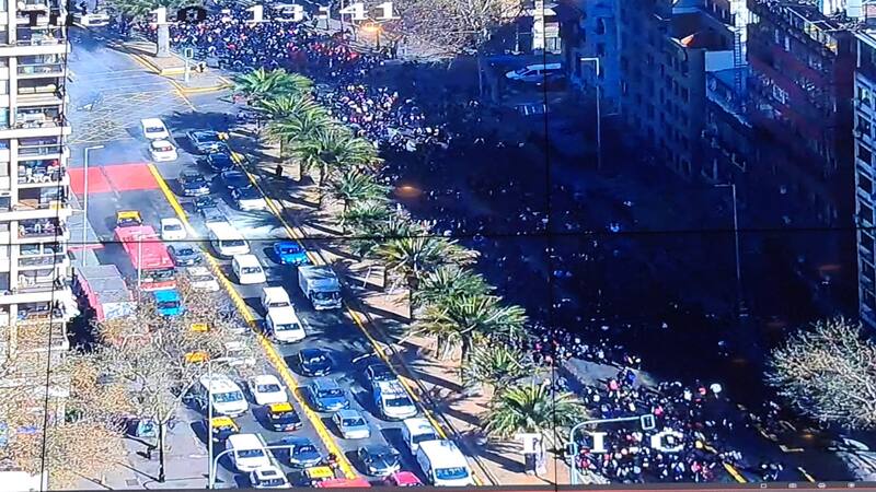 El Ministerio de Transportes reportó distintos desvíos de tránsito en el sector. Los estudiantes se desplazaron utilizando por completo la calzada norte de la Alameda General Bernardo O’Higgins en una extensa columna.
