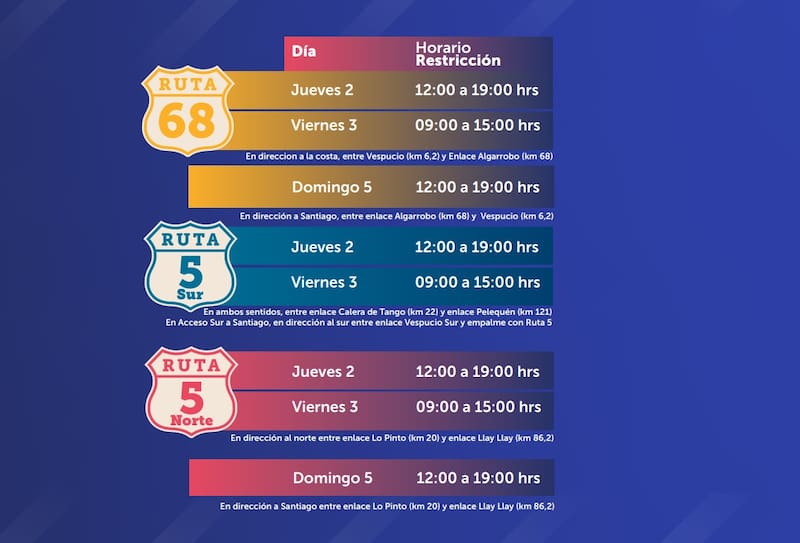 - Ruta 5 Norte: El jueves de 00.00 a 7.00 de la mañana y viernes de 00.00 a 7.00 en ambos sentidos en el Peaje Las Vegas.
