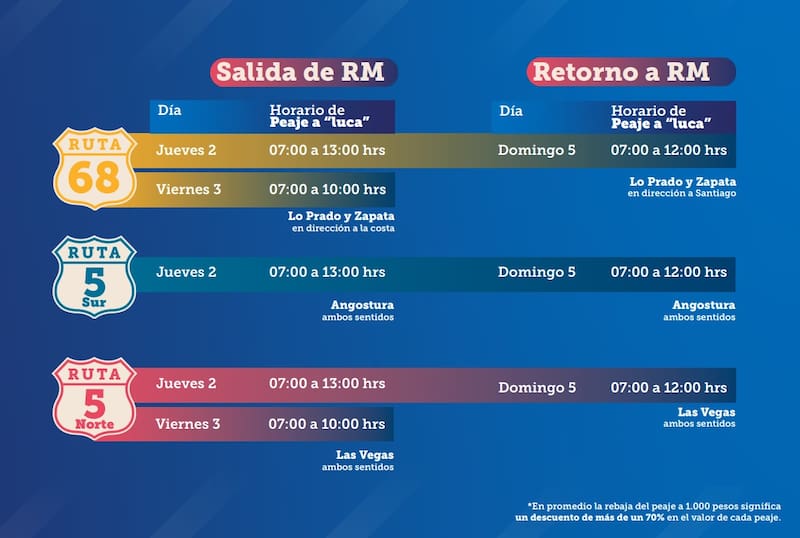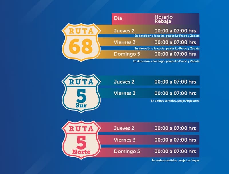 - Ruta 68: El jueves de 00.00 a 7.00 de la mañana en dirección a la costa en los peajes de Lo Prado y Zapata. El viernes de 00.00 a 7.00 de la mañana también en dirección a la costa y el domingo de 00.00 horas a 7.00 de la mañana en dirección a Santiago.