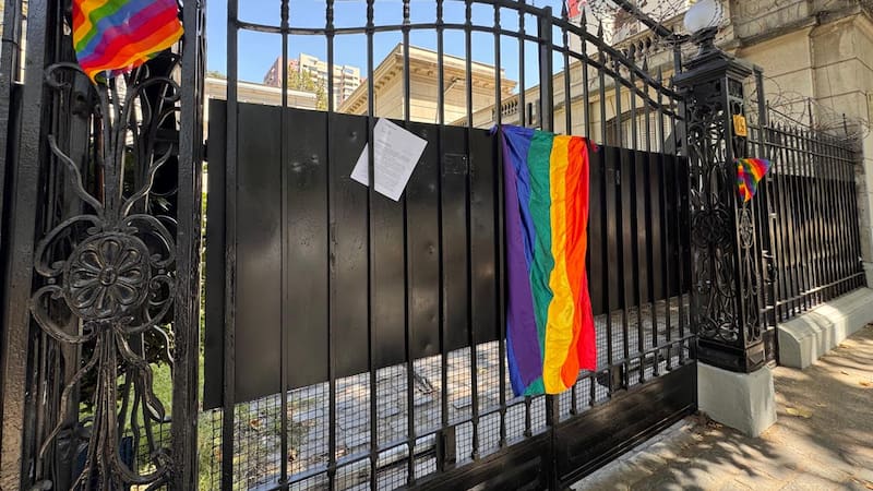 Este sábado, miembros del Movimiento de Integración y Liberación Homosexual (Movilh) se congregaron en el frontis del edificio de la Embajada Argentina, para protestar frente a las declaraciones del presidente Javier Milei respecto a la comunidad LGBTQI+.