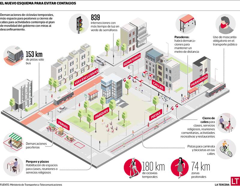 En esa línea, la ministra de Transportes, Gloria Hutt, presentó el plan nacional de movilidad, que permitirá que los municipios puedan aplicar medidas en miras al desconfinamiento. Entre ellas, una de las principales es el cierre de calles para actividades como clases, reuniones comunitarias y servicios religiosos, y la asignación de espacios en parques y plazas. “En el desconfinamiento surge la necesidad de tener más espacio, y para eso hay que entregar seguridad”, dijo Hutt.