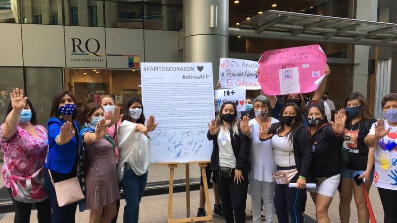Una treintena de mujeres se congregó este viernes en el frontis de la Superintendencia de Pensiones para exigir que se cumpla con la entrega de los dineros retenidos a deudores de pensión alimenticia que solicitaron el retiro del 10% de sus fondos de pensiones en agosto.
