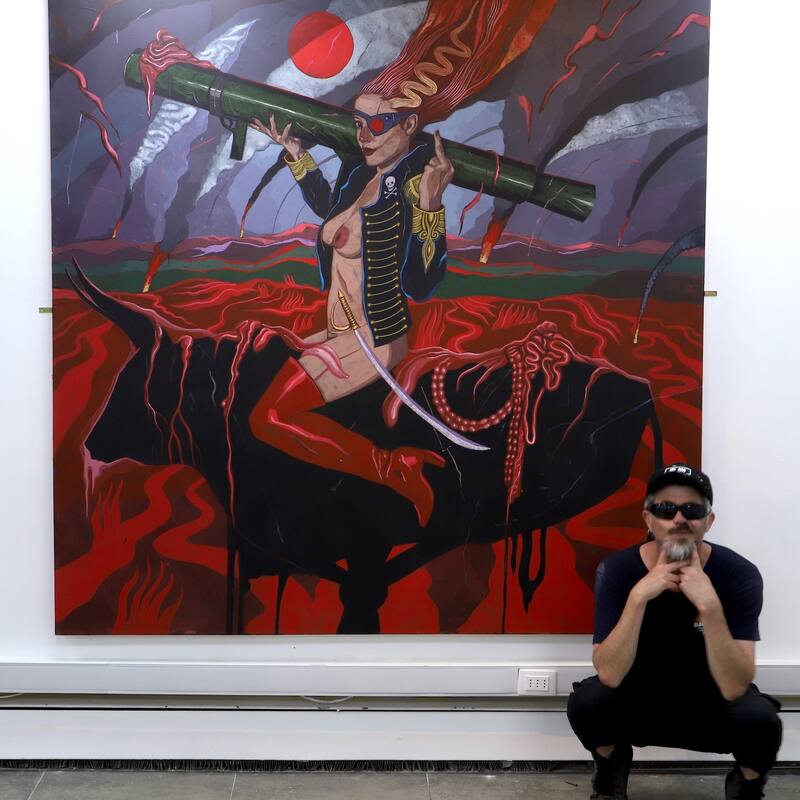 Entre las piezas de la exhibición figuró un acrílico sobre tela de dos por dos metros denominada Máquina de Guerra, del pintor Luis Almendra.