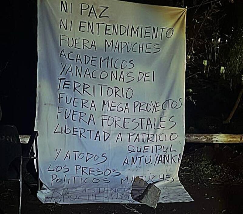 “Ni paz ni entendimiento. Fuera mapuches académicos yanaconas del territorio, fuera megaproyectos, fuera forestales”, decía el lienzo.