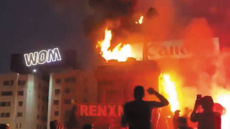 A las 20.58, tras la dispersión de los manifestantes por parte de personal policial, un carro lanzaguas apagó las llamas en la estructura.