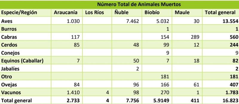 La región de Ñuble es la más afectada por esta situación, con un catastro de 7.756 animales sin vida.