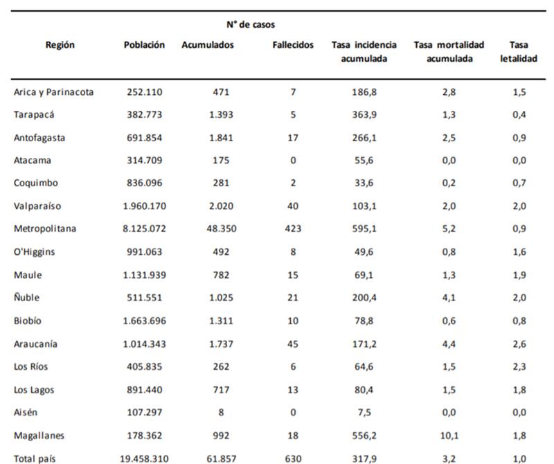 La Región Metropolitana, por su parte, tiene una tasa de letalidad de 0,9%, pues han fallecido 423 personas del total de 48.350 Covid-19 positivo.