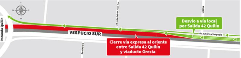 Este viernes en la madrugada se cerró la autopista Vespucio Sur hacia el oriente -sector de Av. Los Presidentes-, entre la salida 42 Quilín hasta la salida Viaducto Grecia Oriente para poder realizar los trabajos previos necesarios para la ejecución de un bypass. Estos trabajos durarán hasta el domingo 4 de febrero.