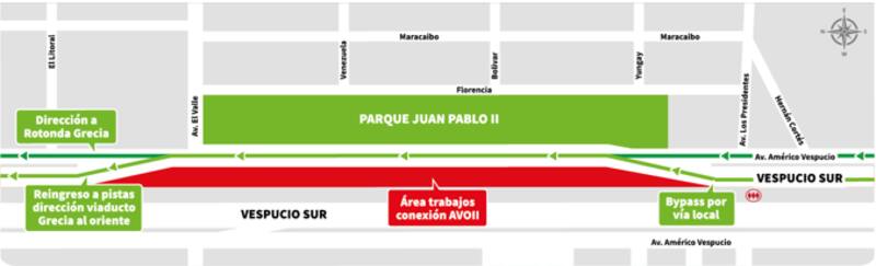 Ese día, y por un tiempo de 58 meses en total, se implementará un bypass que desviará el tránsito de la autopista Vespucio Sur al oriente entre Av. Los Presidentes y Av. El Valle, en la comuna de Peñalolén, hacia la vía lateral de Av. Américo Vespucio.
