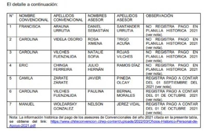 “Se registra el pago de cuatro asesores de Convencionales que no prestaron servicios durante el resto del 2021; el pago de un asesor de convencional que no prestó servicio en el mes de agosto del 2021, es decir, se paga julio retroactivamente, y luego entra a regir su contratación a contar de septiembre; y el pago de dos asesores de Convencionales que no prestaron servicio durante los meses de agosto y septiembre. Es decir, se les paga julio retroactivamente, y luego se entra a regir su contratación a contar de octubre”, se lee en la querella.