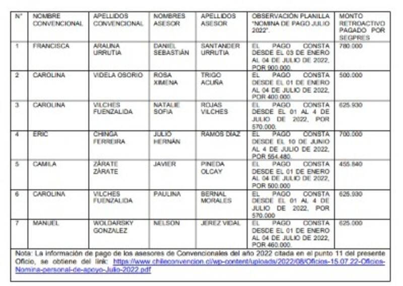 Dado que aquello se aprobó con más de 90 votos a favor, se expresa en el escrito, “el Ministerio Secretaría General de La Presidencia generó la emisión de dos Resoluciones Exentas que autorizaron los pagos retroactivos de servicios por el mes de julio del 2021 a 112 asesores de 65 convencionales constituyentes por $89.222.336 de pesos”.