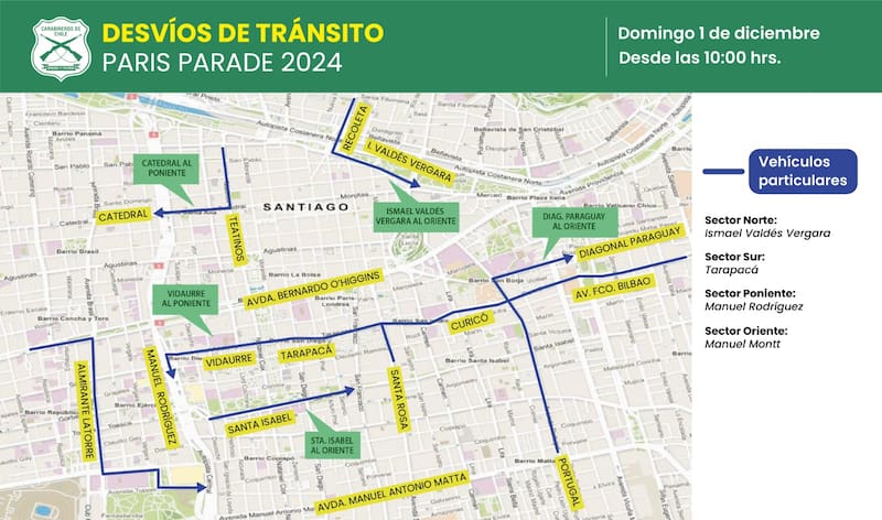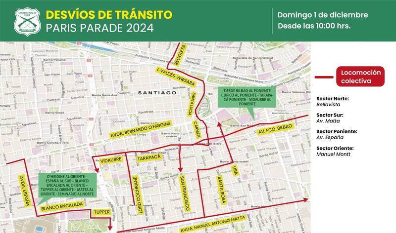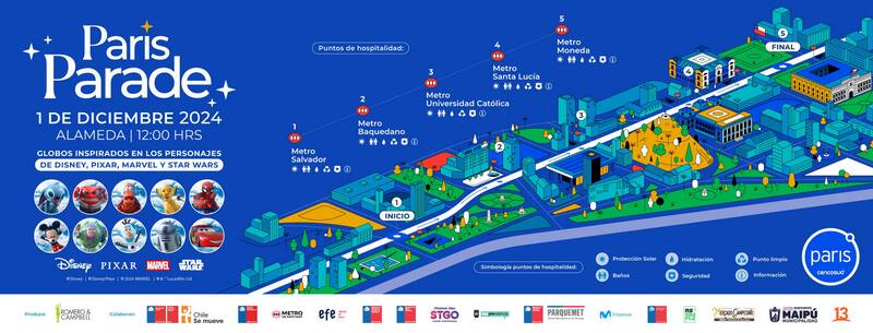 El evento y desfile del Paris Parade se realizará este domingo 1 de diciembre a las 12.00 horas desde el sector de Av. Providencia, a la altura de Av. Salvador. Desde ahí pasará por Plaza Baquedano y luego por la Alameda hasta llegar a La Moneda. En total, será un recorrido de 3 km donde se espera una concurrencia de más de 40 mil personas.