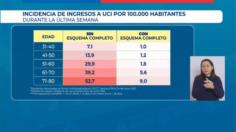 Otro de los argumentos que presentó Enrique Paris durante el balance de hoy para defender el proceso de inoculación en Chile fue la relación de pacientes vacunados y no vacunados en el ingreso de hospitalizaciones UCI durante la última semana. Según la información entregada respecto al grupo etario entre 51 y 60 años, 29,9 de cada 100 mil habitantes ingresan a la UCI cuando no tienen su esquema completo.