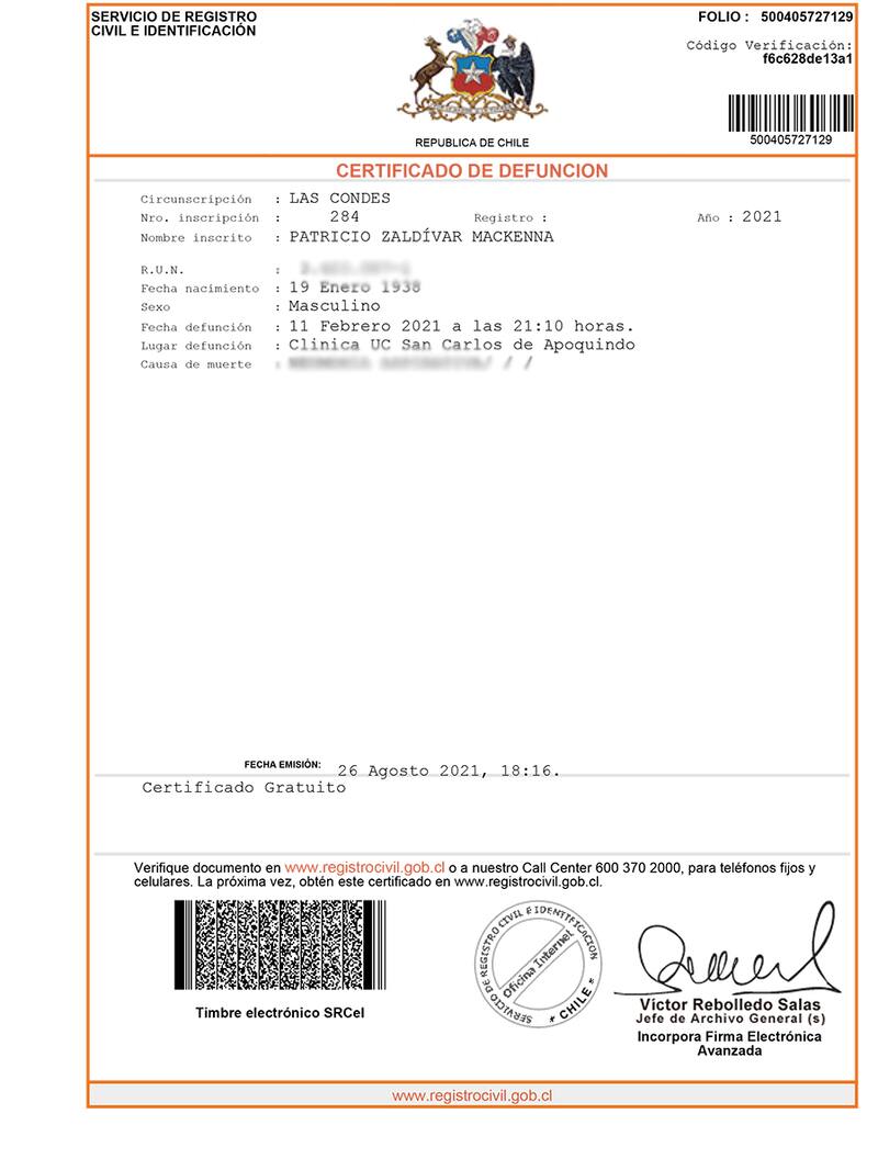 De acuerdo al certificado de defunción de Zaldívar Mackenna, al cual accedió La Tercera, su deceso ocurrió el 21 de febrero de este año.