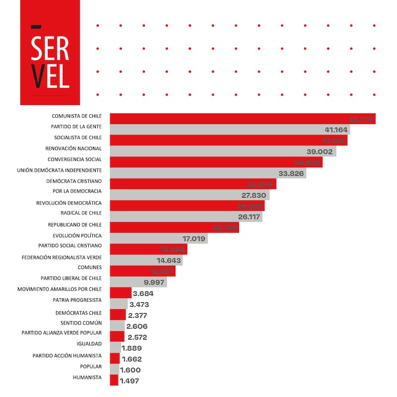 Lo sucede el Partido de la Gente, con 41.164; el Partido Socialista (PS) se queda en el tercer lugar del podio con 41.102 afiliados, los socialistas tuvieron un leve incremento, en 2023 alcanzaron los 40.590 militantes.