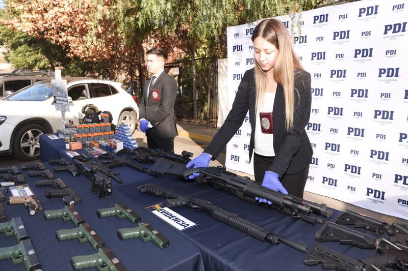Además, la PDI incautó una gran cantidad de armas: un fusil convencional, tres fusiles de airsoft; dos rifles convencionales; un rifle de airsoft; cuatro escopetas; 16 pistolas; una pistola de aire comprimido y una de airsoft; munición balística de diversos calibres; cargadores; cascos balísticos; chalecos antibalas; un dron; blancos de tiro; antiparras; y protectores balísticos, entre otras especies.