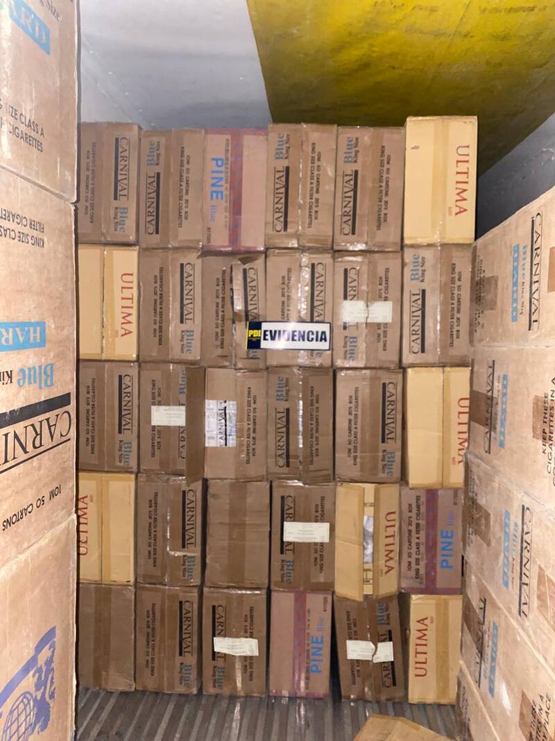 En medio del procedmiento la PDI detuvo a dos ciudadanos perunos y además, encontró una carga de 431 pacas contenedoras, con 500 unidades cada una, es decir, alrededor de 215.500 cajetillas recuperadas.