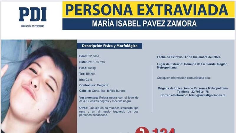 La Fiscalía Metropolitana Oriente informó este jueves del hallazgo del cadáver de María Isabel Pavez Zamora, joven de 22 años, reportada como desaparecida desde el 17 de diciembre en la comuna de La Florida.
