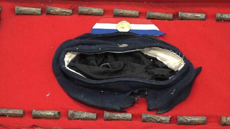 Se trata de una gorra, vainas de fusil y una medalla conmemorativa de los 50 años del Combate Naval de Iquique.
