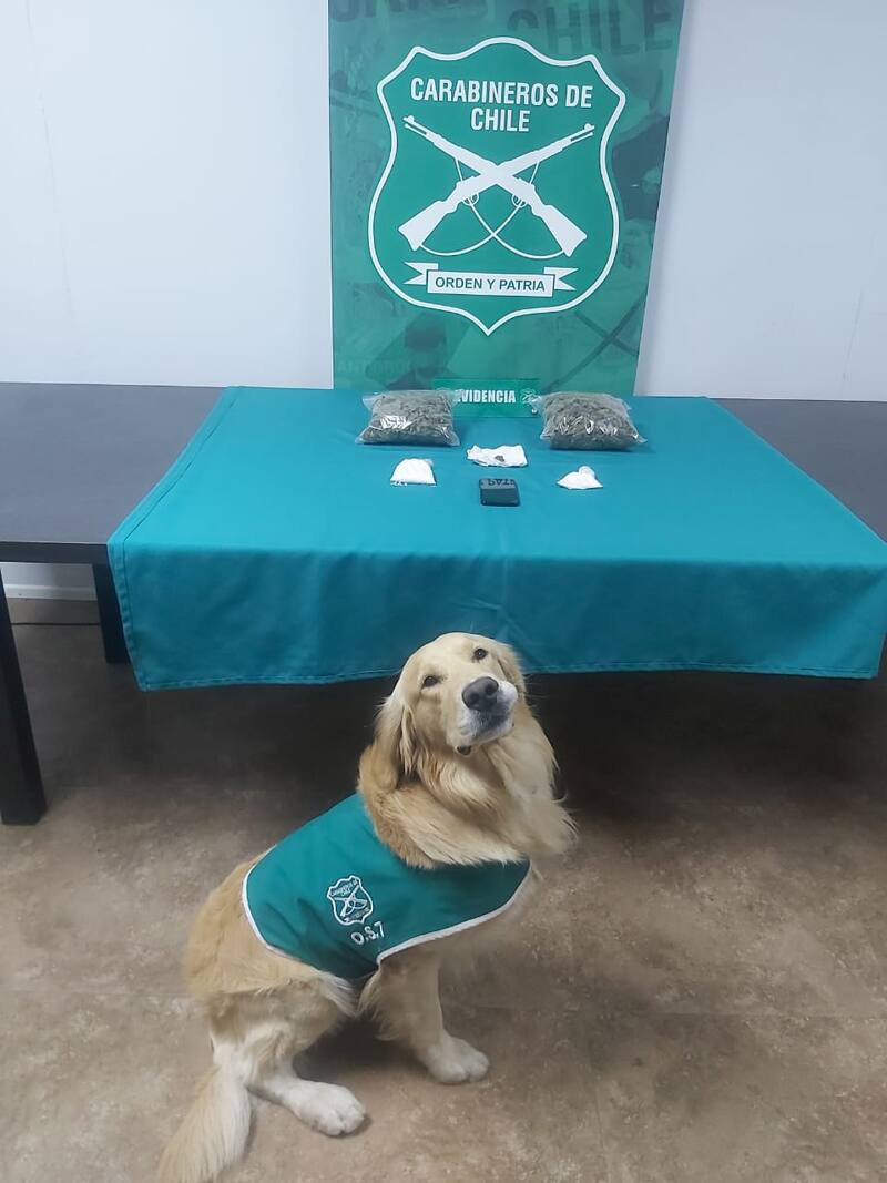 Un perro fiscalizador del OS7 de Rancagua fue agredido por un sujeto al que le encontraron droga en un bolso.