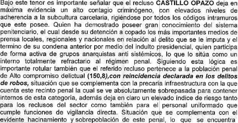 Desde Gendarmería señalan que Castillo tiene una “reincidencia declarada en los delitos de robos, situación que se complementa con la precaria infraestructura con la que cuenta este recinto penal”.