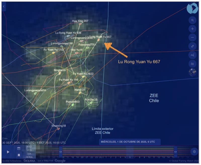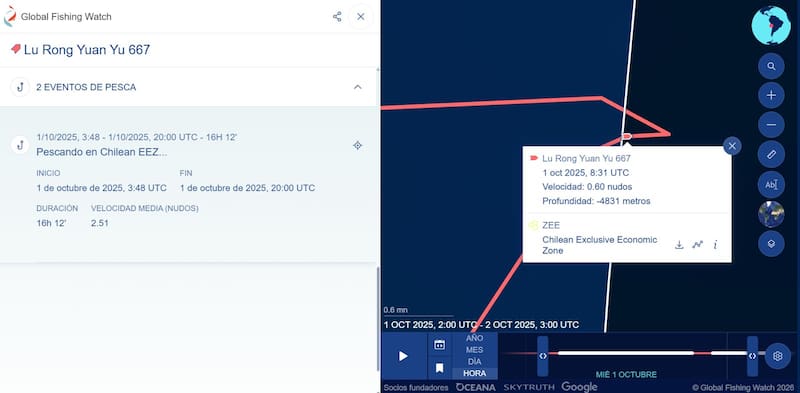 De acuerdo con los antecedentes expuestos en el recurso, el buque ingresó a la ZEE durante la madrugada del 1 de octubre de 2025. Si bien su permanencia fue acotada, de al menos 47 minutos, el registro indica que alcanzó a internarse cerca de 594 metros dentro del área, espacio en el que la legislación chilena prohíbe la actividad pesquera de naves extranjeras.