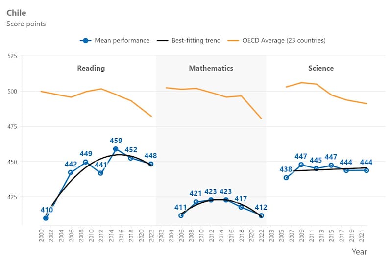 En matemáticas, Chile obtuvo 412 puntos, en ciencias 444 puntos y en lectura 448, bajo el promedio OCDE en las tres evaluaciones y superando a países como México, Brasil e Indonesia, pero bajo España, Portugal y Turquía.
