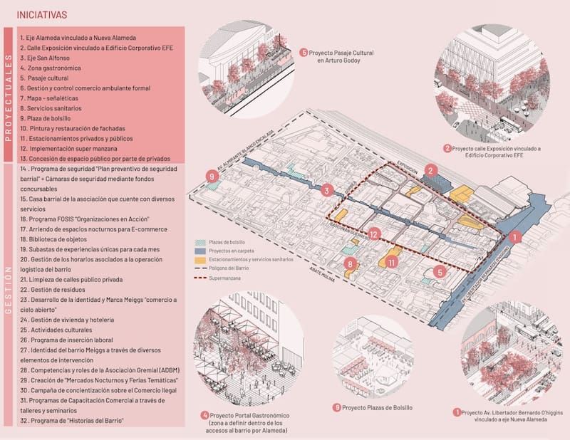 Para ello, se proponen 32 iniciativas de proyectos y de gestión, considerando tres ya existentes que son el Eje Alameda-Providencia, el edificio corporativo de EFE y el Eje San Alfonso. Dentro de las propuestas de intervención en gestión se encuentran una serie de iniciativas sociales como complemento a todas aquellas de seguridad y las proyectuales.