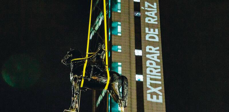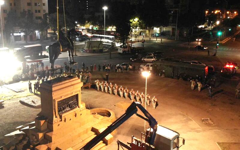 Gritos más, consignas menos, lo cierto es que durante la mañana y buena parte de la tarde la plaza se apreciaba en calma. No hay agitación, como sí la hubo durante la madrugaba, mientras se retiraba con grúas el monumento, cuando 25 personas fueron sorprendidas por Carabineros rompiendo el toque de queda, otras cuatro por desórdenes y una fue detenida por atentado contra la autoridad. Con minutos de diferencia, los militares presentes en el operativo le rendirían homenajes a Baquedano, aunque con algunas pifias de fondo y una posterior intervención luminaria de Delight Lab en uno de los edificios aledaños que rezaba “extirpar de raíz”. Piñera, en la misma entrevista radial, defendía el legado del militar. “Fue el general que condujo al Ejército chileno al triunfo en la Guerra de Pacífico, fue el general que llegó a Lima” y que, por tanto, “es un general que merece respeto, es parte de nuestra historia. Es parte de algo por lo cual todos nos sentimos orgullosos, excepto unos delincuentes que no respetan a nada ni a nadie. No respetan ni al general Baquedano ni a las iglesias”.