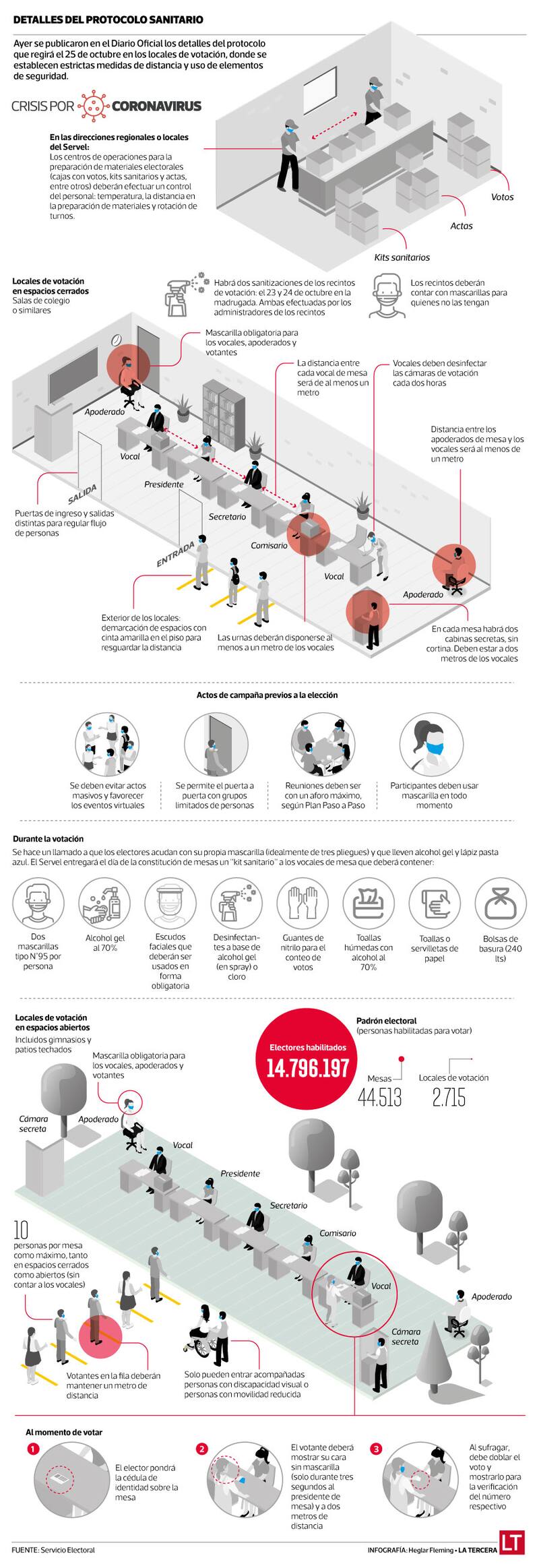 El protocolo fue elaborado luego de recomendaciones dadas por entidades internacionales y sociedades científicas. Gabriel Cavada, epidemiólogo de la U. de Chile, afirma que si los vocales tuvieran “un test PCR negativo podría dar mayor seguridad, pues ellos estarán durante todo el día recibiendo a los votantes”.