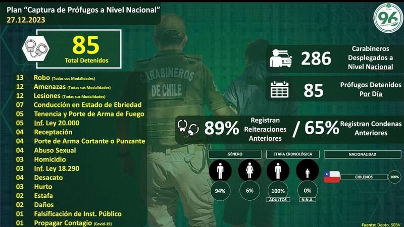 El teniente coronel Francisco Painepán, jefe del SEBV detalló que el procedimiento se dio en el marco de un la que se ejecuta desde abril y que ha permitido la detención de 6.567 personas, el 95% de ellos de nacionalidad chilena. El 13% corresponde a mujeres.