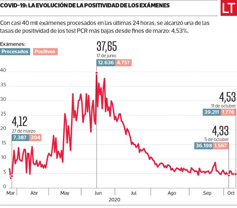 Así, el lunes pasado se registró una pesquisa de un 4,33% (1.567 nuevos casos) respecto a los 36.198 exámenes procesados, la cifra más baja desde el 27 de marzo. Y hoy la positividad de 4,53% estuvo marcada por el récord de 39.211 pruebas informadas en las últimas 24 horas.