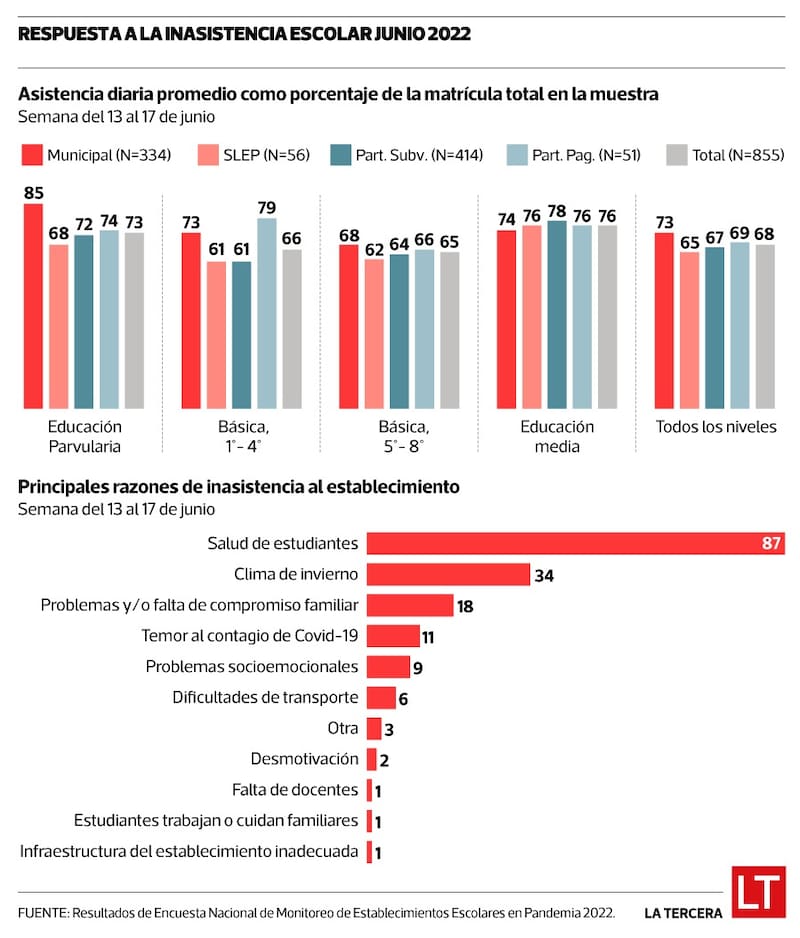 Los resultados señalan que la asistencia promedio de los estudiantes se mantuvo con una “tendencia a la baja”. Esto debido a que en junio, un 68% de los estudiantes fueron a clases, mientras que en abril y mayo la cifra fue de 77% y 72%, respectivamente.