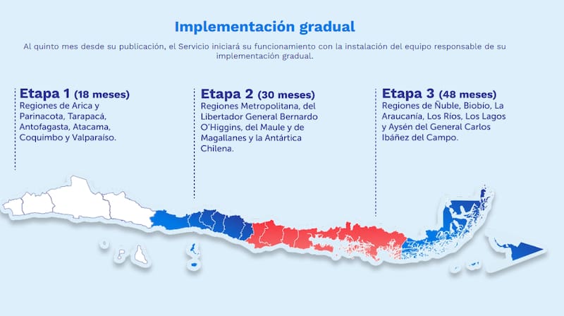 Por su parte, la instalación a nivel regional, se realizará en tres etapas desde publicada la ley, primero a los 18 meses iniciarán sus operaciones las direcciones regionales de la macrozona norte y de la región de Valparaíso; a los 30 meses las direcciones regionales de la zona central, Región Metropolitana y de Magallanes y la Antártica Chilena; a los 48 meses las direcciones regionales del sur del país, desde la Región de Ñuble hasta la Región de Aysén.