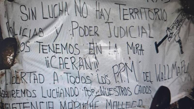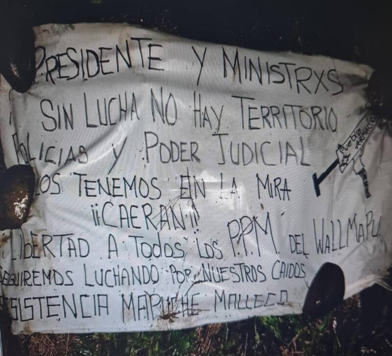 En el lugar donde ocurrieron los hechos fue encontrada una pancarta con alusiones al Gobierno y al poder Judicial: “Presidente y ministros sin lucha no hay territorio. Policías y poder Judicial, los tenemos en la mira ¡Caerán!”. “Libertad a todos los presos políticos mapuches del Wallmapu. Seguiremos luchando por nuestros caídos”, agrega.