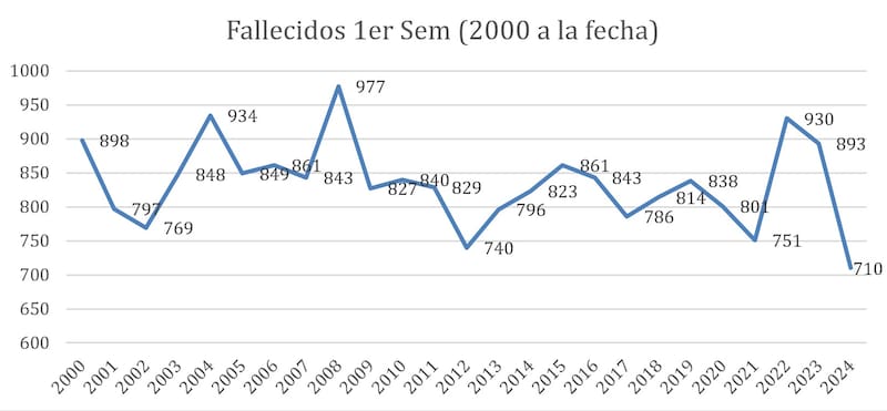 En concreto, el primer semestre de 2024 registró 710 muertes, seguido por el primer semestre de 2012 donde 740 personas fallecieron. En tanto, en el mismo periodo de 2021 murieron 751 personas por esa causa y en 2002 fallecieron 769.