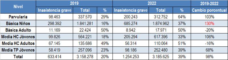 Así, si entre marzo y junio de 2019 hubo 633.414 alumnos en esta línea grave de inasistencia, en 2022 aumentaron a casi el doble: 1.254.253 estudiantes. En ese sentido, el detalle señala que el 39% de la matrícula total del sistema educativo (incluyendo prekínder y kínder) está en esta categoría. Por eso las alarmas de autoridades y especialistas, toda vez que la evidencia señala, como ya expuso Ávila, que la inasistencia muchas veces lleva a la deserción o desvinculación escolar.